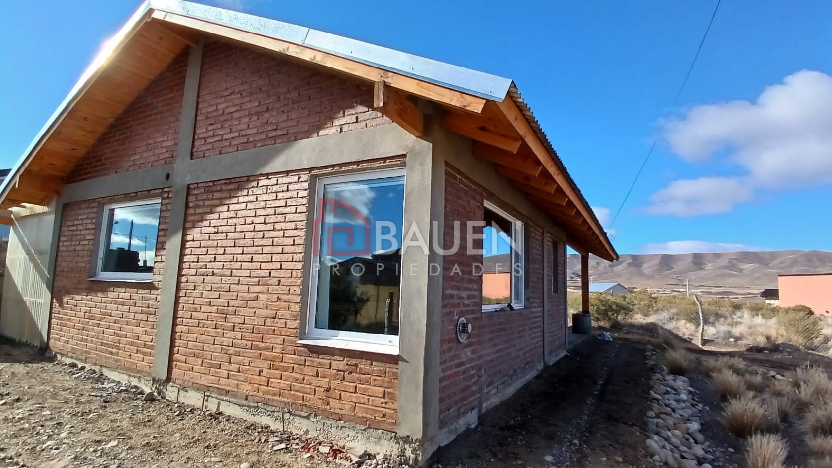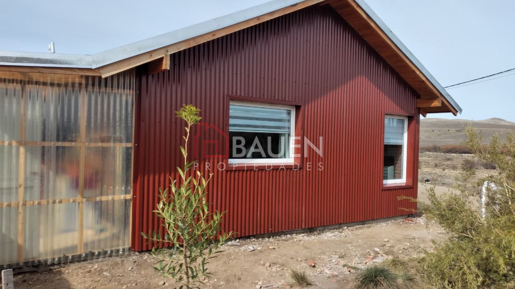 Revestimiento exterior: La parte de la pared oeste está cubierta con chapa acanalada de un color terracota, lo que le da un aspecto robusto y moderno común en climas con condiciones variables . En su frente toda de ladrillo visto, aberturas doble vidrio en pvc.